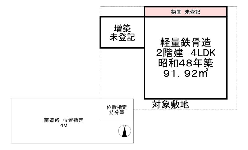 現況:空家 ※軽量鉄骨造2階建て・91.92㎡(公簿)・一部増築未登記有
